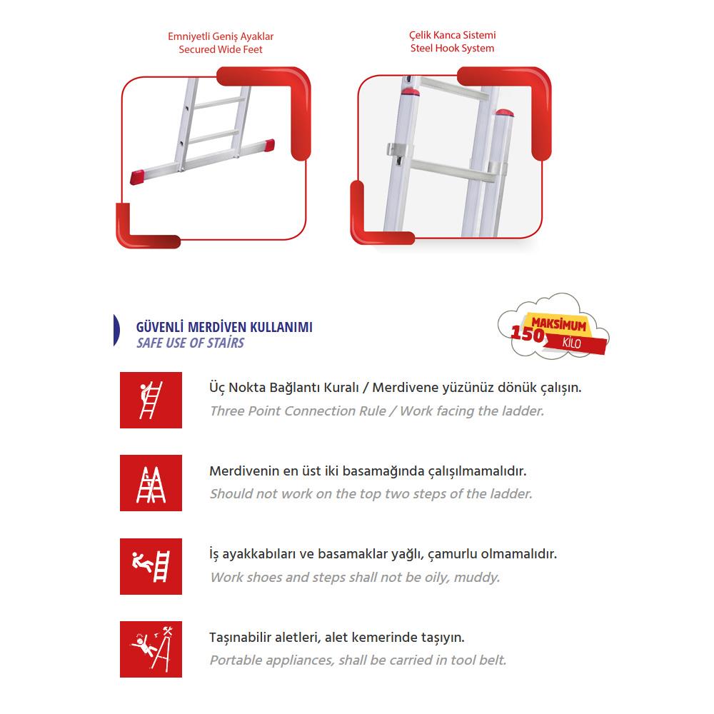 merdivendir. Çift sürgülü tasarımı, merdivenin her iki parçasının da ayrı ayrı uzatılabilmesine imkan verir, böylece farklı yüksekliklerde esnek bir kullanım sağlar. Hem profesyonel