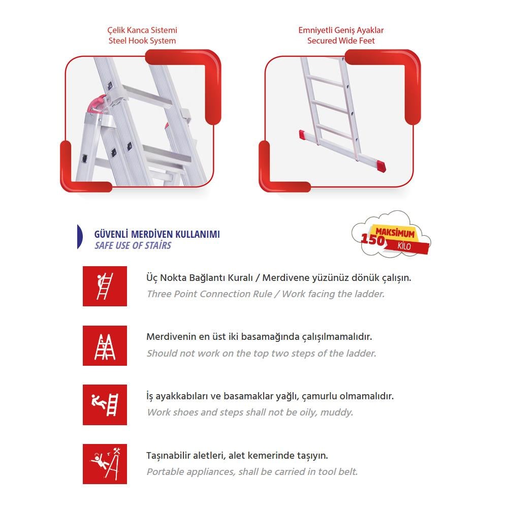 Güvenlik Özellikleri: Kaymaz basamaklar, güvenlik kilitleri ve geniş taban ayakları ile maksimum güvenlik sağlar.