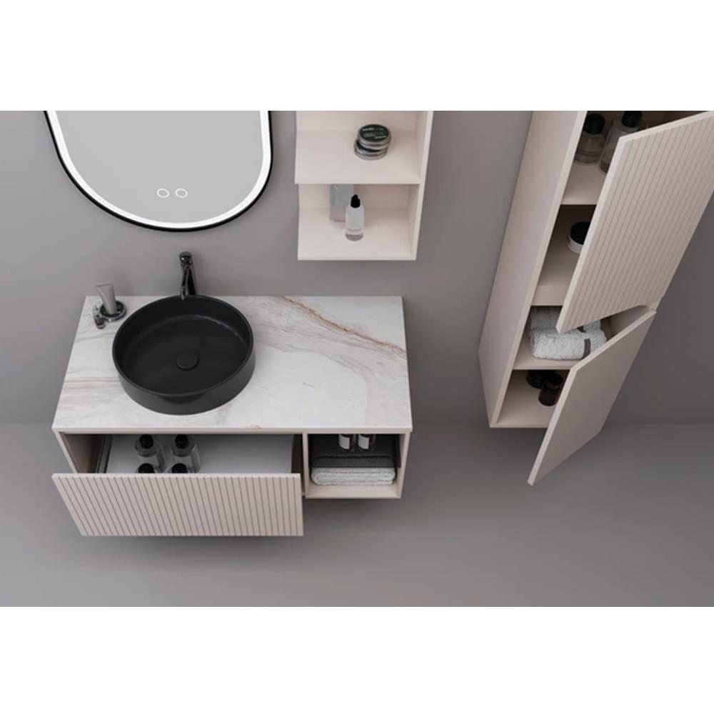 Aquanil Almonde 100 cm banyo dolabı, şık ve modern tasarımıyla banyonuza estetik bir dokunuş katar. Siyah lavabosu ve krem rengi dolap kombinasyonu, sofistike ve çağdaş bir