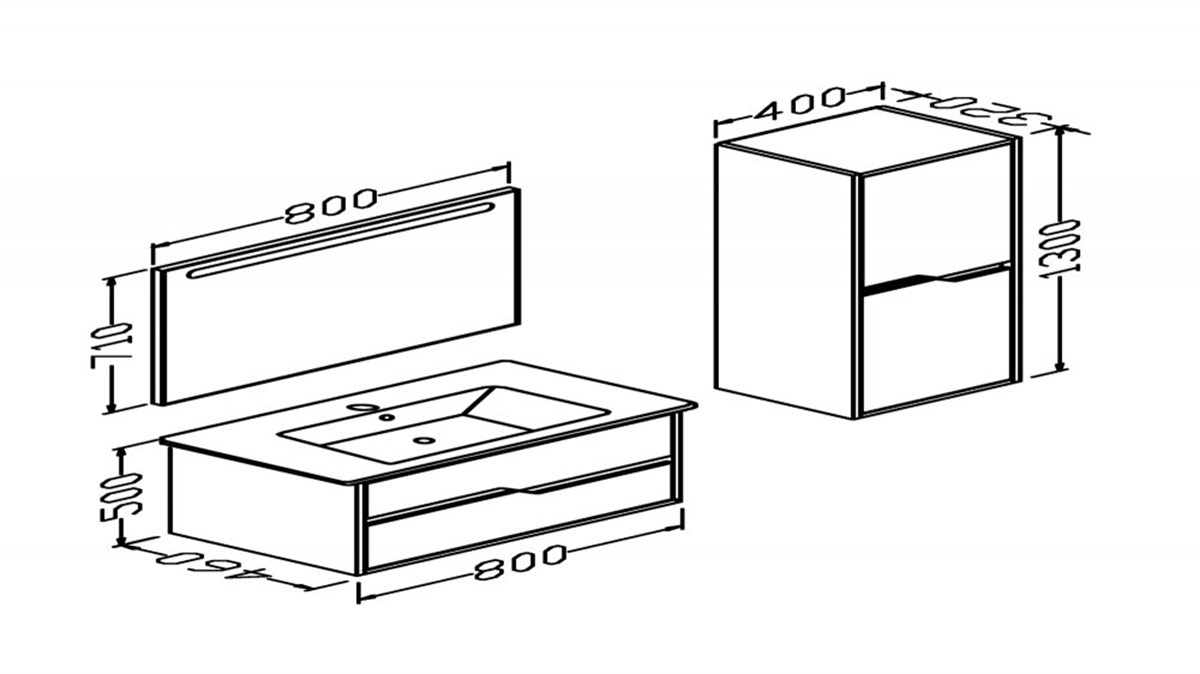 Alt modül: En 80 cm Derinlik 46 cm Yükseklik 50 cm ( iki çekmeceli)