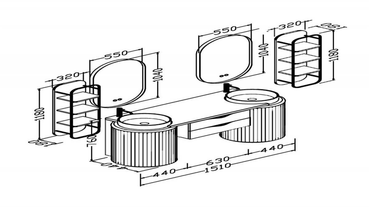 Alt modül: En 151 cm Derinlik 44 cm Yükseklik 76 cm ( iki kapaklı ve iki çekmeceli )