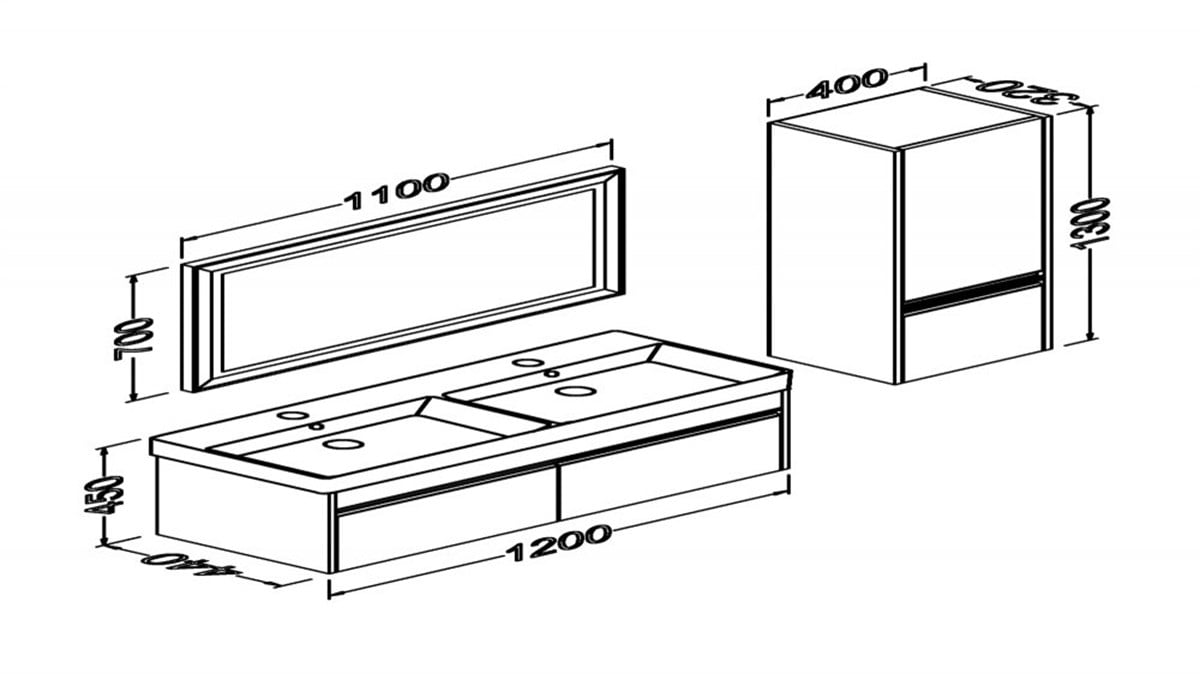 Alt modül: En 120 cm Derinlik 44 cm Yükseklik 45 cm ( iki çekmeceli)