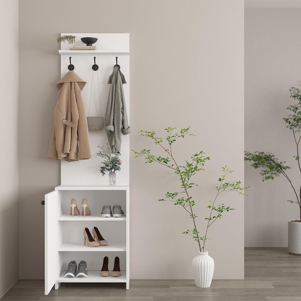 askılığı sayesinde mont, çanta ve aksesuarlarınızı kolayca asmanıza olanak tanır. Alt kısmındaki kapaklı bölme ve iç rafları ile ayakkabılar veya diğer eşyalar için pratik bir