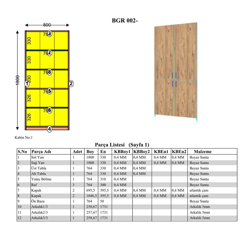 beyaz melamin kaplı yonga levhadan, kapakları ise atlantik çam desenli melamin kaplı yonga levhadan üretilmiştir. Bu kombinasyon sayesinde sade ve modern bir tasarım sunar.