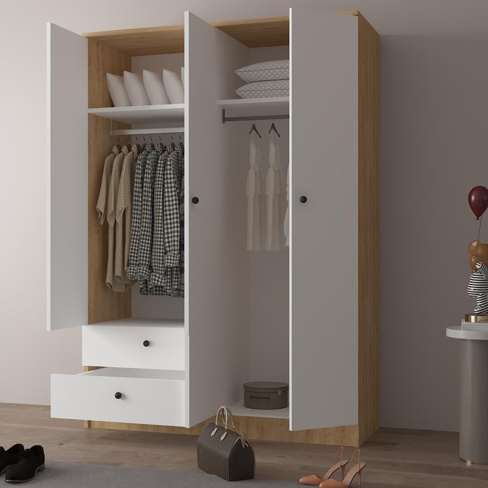 sunarken, entegre çekmeceleri ve askılı bölmesi sayesinde kıyafetlerin düzenli ve kolay erişilebilir şekilde saklanmasını sağlar.