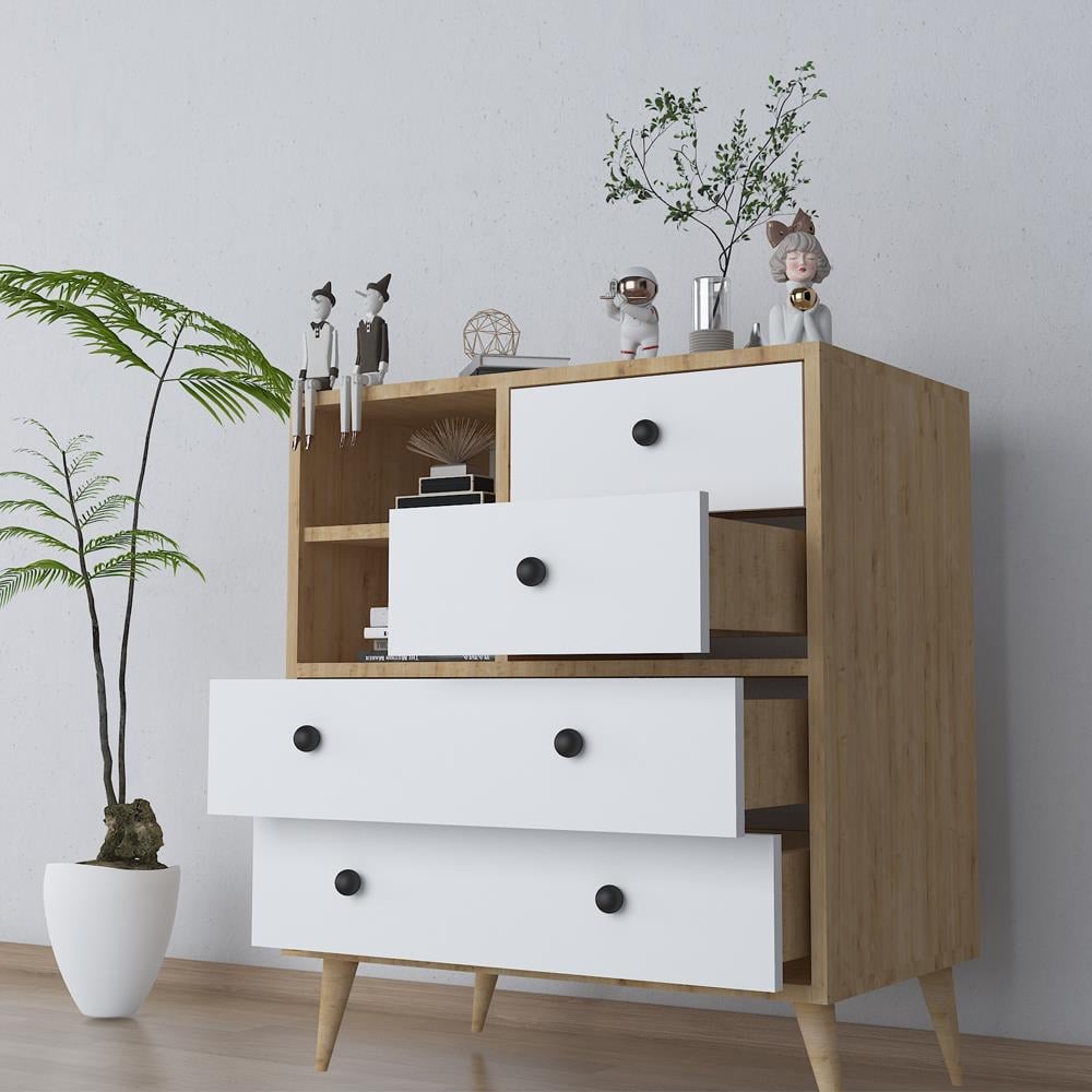 Tasarım: 4 çekmeceli ve açık raflı yapı ile fonksiyonel kullanım alanı sunar