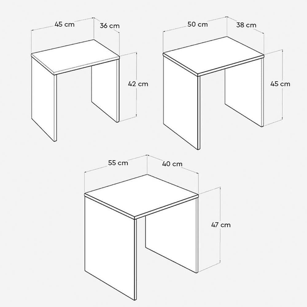 Farklı boyutlardaki üç ayrı sehpa, iç içe geçebilen yapısıyla yer tasarrufu sağlar ve ihtiyaç anında kolayca kullanılabilir.