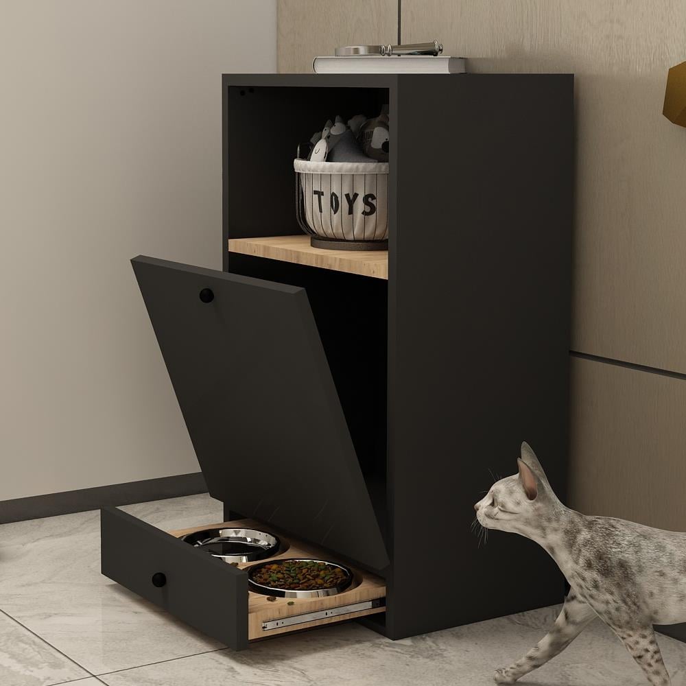Tasarım: Üst kısmında mama ve su kapları için ayrılmış özel bölüm, alt kısmında ise kedinizin veya küçük ırk köpeğinizin dinlenip oyun oynayabileceği geniş ve rahat bir alan