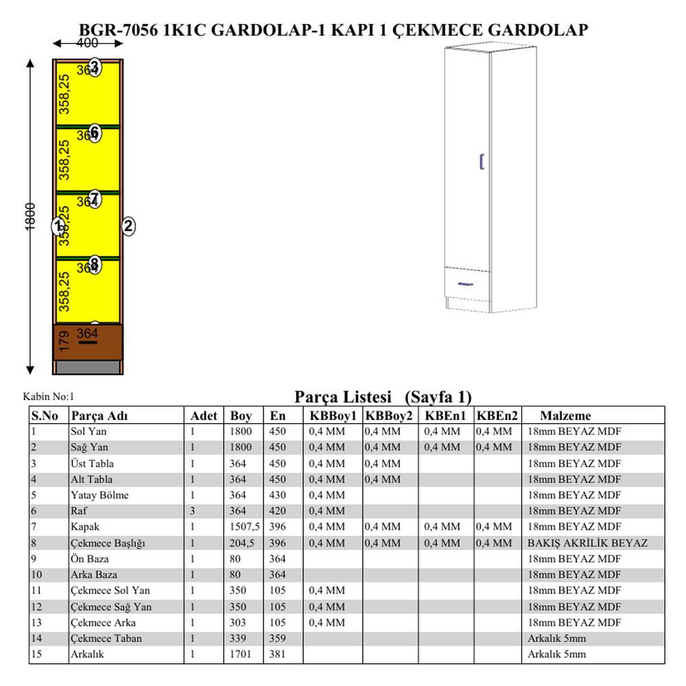 Bgr 7056 Tek Kapılı Tek Çekmeceli Gardırop