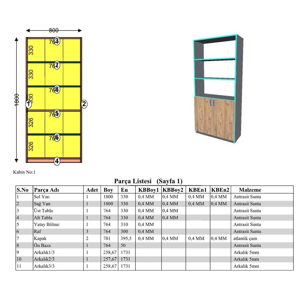 melamin kaplı yonga levhadan, kapakları ise doğal görünümlü atlantik çam melamin kaplı yonga levhadan üretilmiştir. İki adet geniş kapaklı bölmesi, klasör ve belgeler için ideal