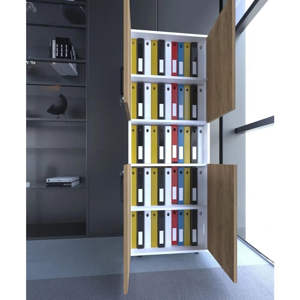 Beyaz gövde ve ahşap kapakları ile modern bir tasarıma sahip olan bu ofis dolabı, şıklığı ve güvenliği bir arada sunar. Kilitli kapakları sayesinde ofis belgelerinizi ve değerli