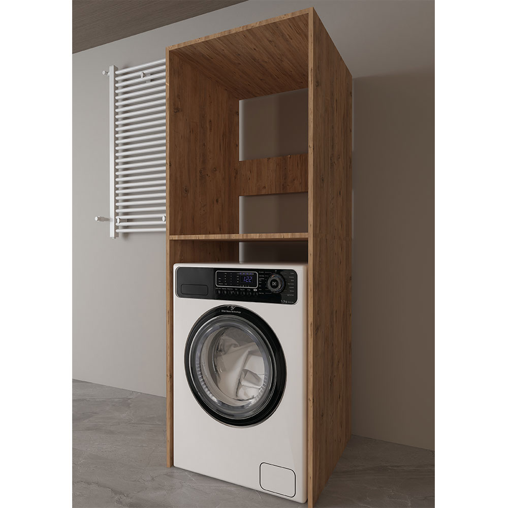 Çamaşır makinesi dolabı BGR 2004, 184,5 cm yüksekliği, 67 cm genişliği ve 60 cm derinliği ile hem çamaşır hem de kurutma makineleri için uygundur. Gövdesi safir meşe melamin kaplı yonga levha malzeme ile üretilmiştir. Alt bölümü makine yerleşimi için boş bırakılmıştır. Üst kısmındaki kapaklı raf bölmesi, deterjan, yumuşatıcı, temizlik ürünleri ve diğer malzemeler için ideal bir saklama alanı sunar.