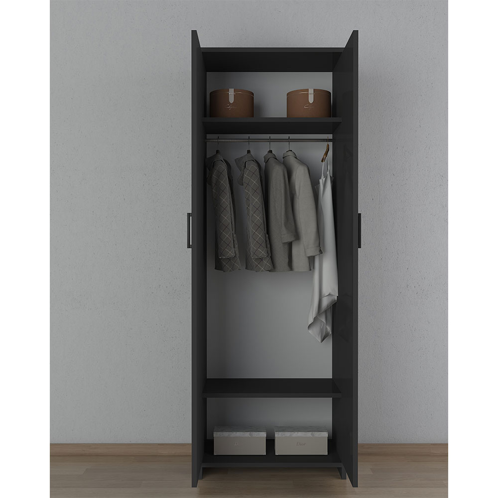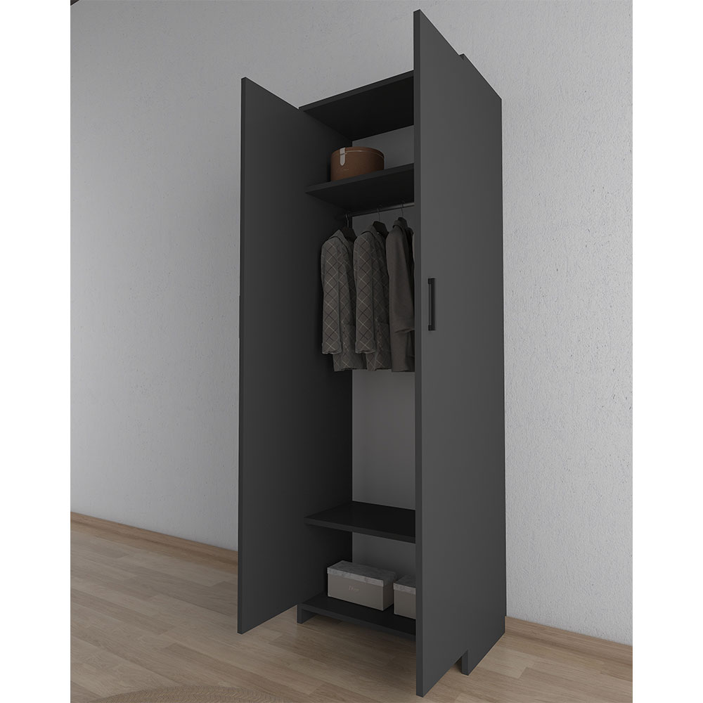 Gardırop BGR 1014 modeli, 174 cm yüksekliği, 60 cm genişliği ve 44 cm derinliği ile kompakt ama kullanışlı bir tasarıma sahiptir. Gövdesi ve kapakları antrasit melamin kaplı yonga levha malzemeden üretilmiştir. İç kısmında askı borusu ve raf bölmesi yer alır. Askılı ve katlanabilir kıyafetlerin düzenli bir şekilde saklanmasını sağlar. Kapaklı yapısıyla eşyaları dış etkenlerden korurken sade ve şık bir görünüm sunar.