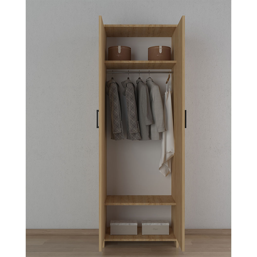 Gardırop BGR 1015, 174 cm yüksekliği, 60 cm genişliği ve 44 cm derinliği ile hem kompakt hem de kullanışlı bir depolama çözümüdür. Gövdesi ve kapakları safir meşe melamin kaplı yonga levha malzemeden üretilmiştir. İç bölümünde askı borusu ve raf alanı bulunur, bu sayede hem askılı hem de katlanabilir giysiler düzenli şekilde yerleştirilebilir. 2 kapaklı sade tasarımı ile hem işlevsel hem de dekoratif bir üründür.