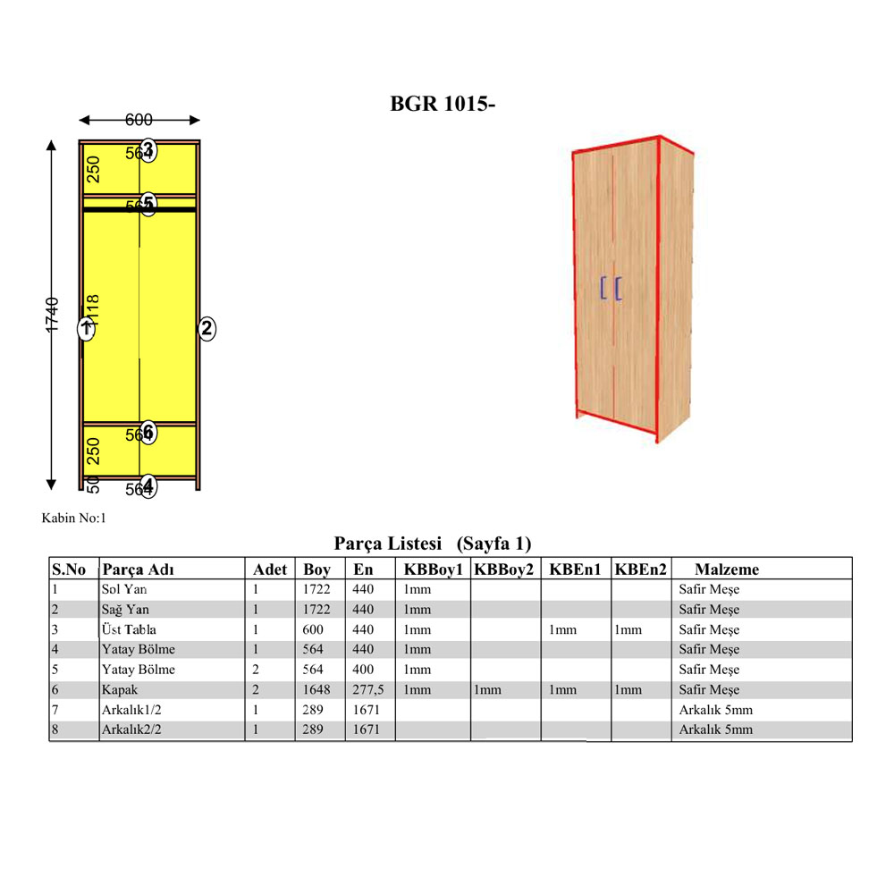 BGR 1015 2 kapaklı gardırop hangi özelliklere sahiptir?