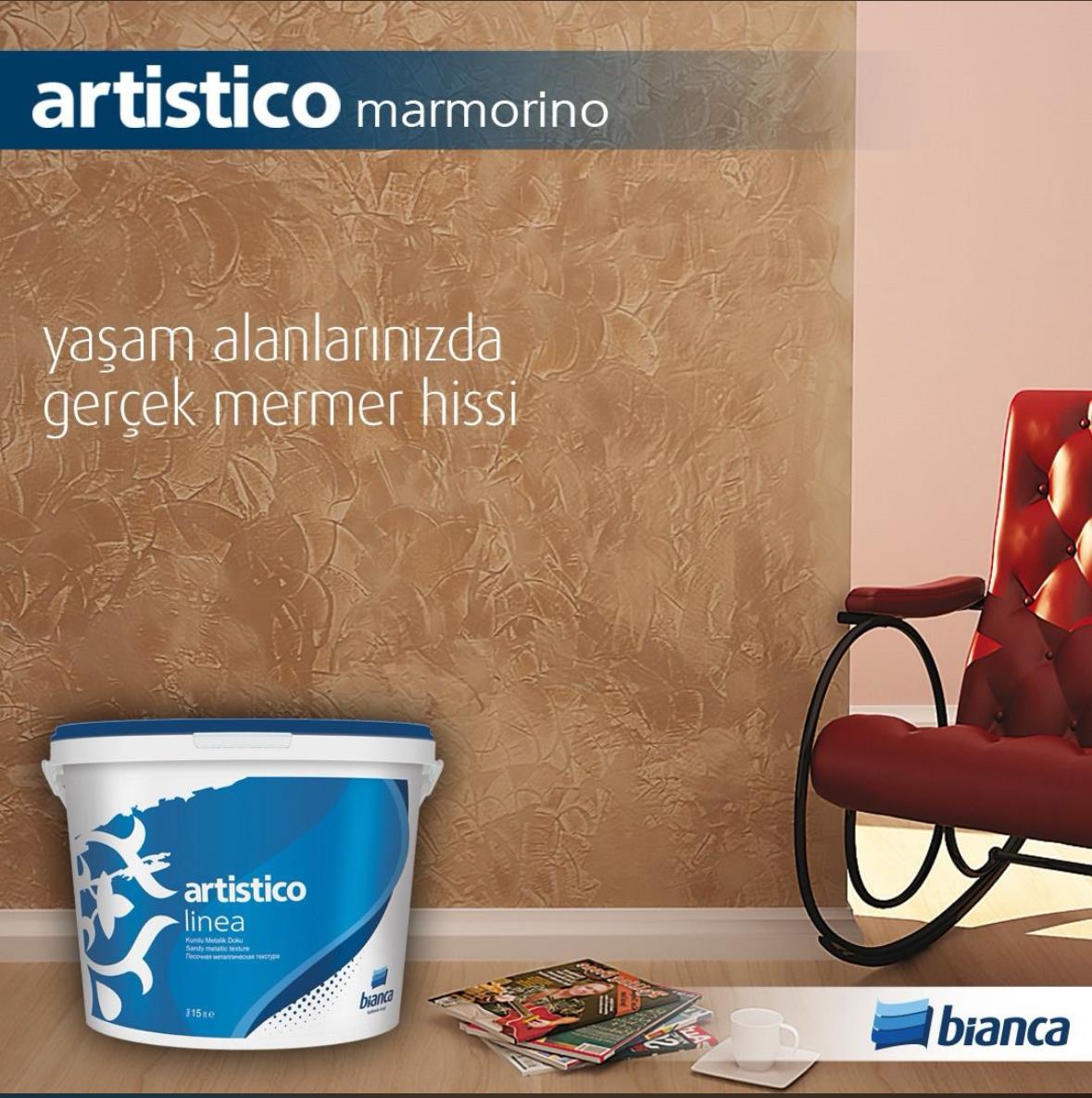 Zemin hazırlıkları tamamlanmış yüzeye, mala ile macun kıvamındaki Bianca Artistico Marmorino inceltilmeden, ilk kat yayılarak uygulanmalıdır. Yüzey henüz kurumadan mala yardımı ile ikinci kez uygulama yapılır. Yüzey her iki yandan, dıştan içe doğru dairesel hareketler ile pürüzsüz hale getirilir. Yüzey kuruduktan sonra üçüncü kat spatula ile yama deseni şeklinde uygulanmalıdır. Uygulamanın hemen ardından, ürün henüz kurumadan mala ile parlatma işlemine başlanır. Yüzeye çok baskı uygulamadan, dikkatli bir şekilde çalışılmalıdır. Yüzeye fazla baskı uygulandığı takdirde çizilmiş bir görüntü oluşur. Parlatma işlemi tamamlandıktan sonra 24 saat kurumaya bırakılmalıdır.