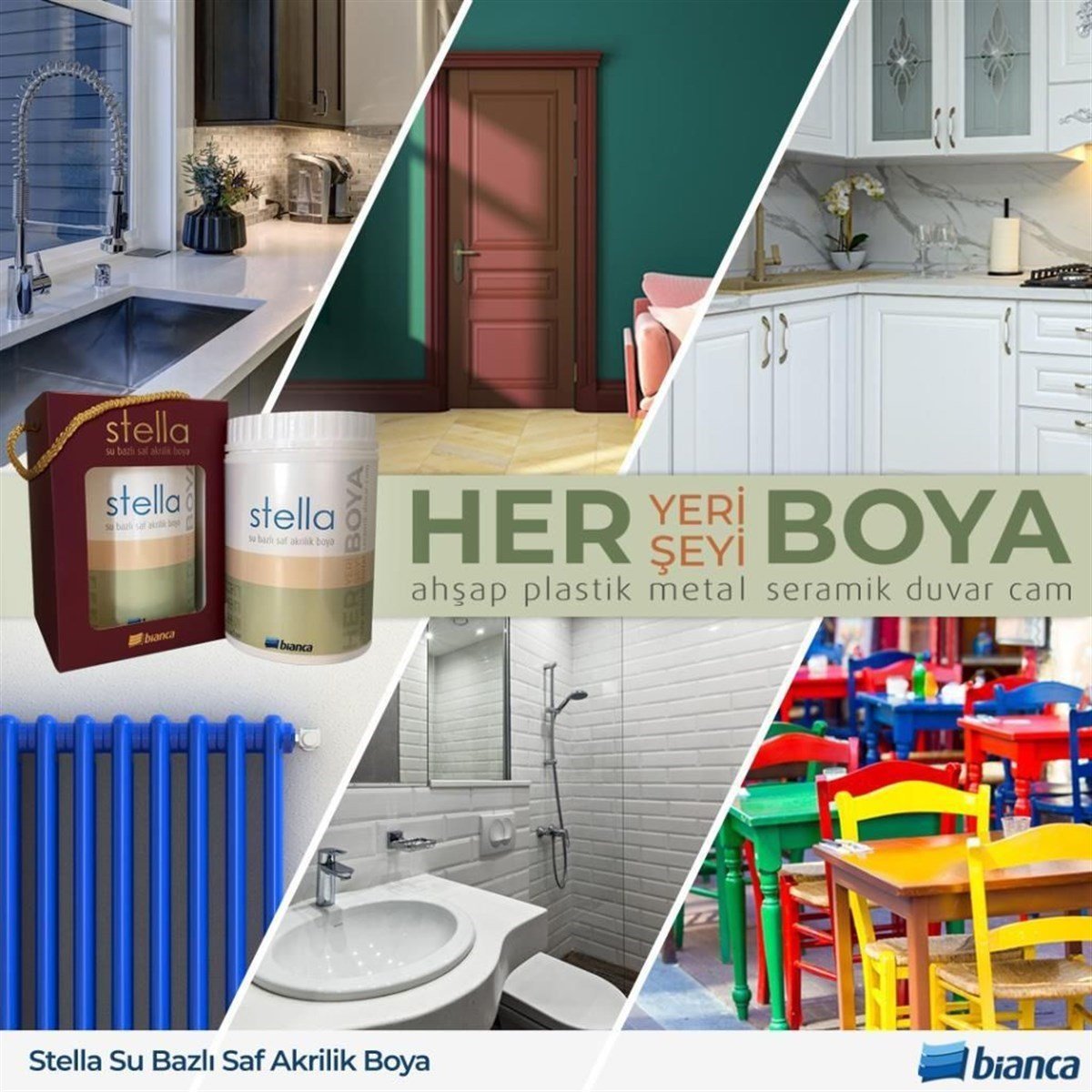 Bianca Stella, her türlü ahşap, mobilya, parke, laminant, seramik, fayans, mermer, cam, plastik, metal, alüminyum, galvaniz, çinko, porselen, kumaş, duvar, taş, kâğıt, karton gibi yüzeylerde uygulanabilir.