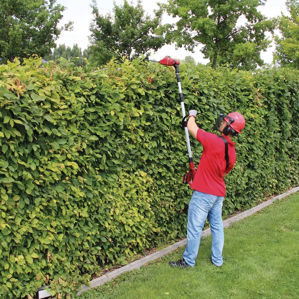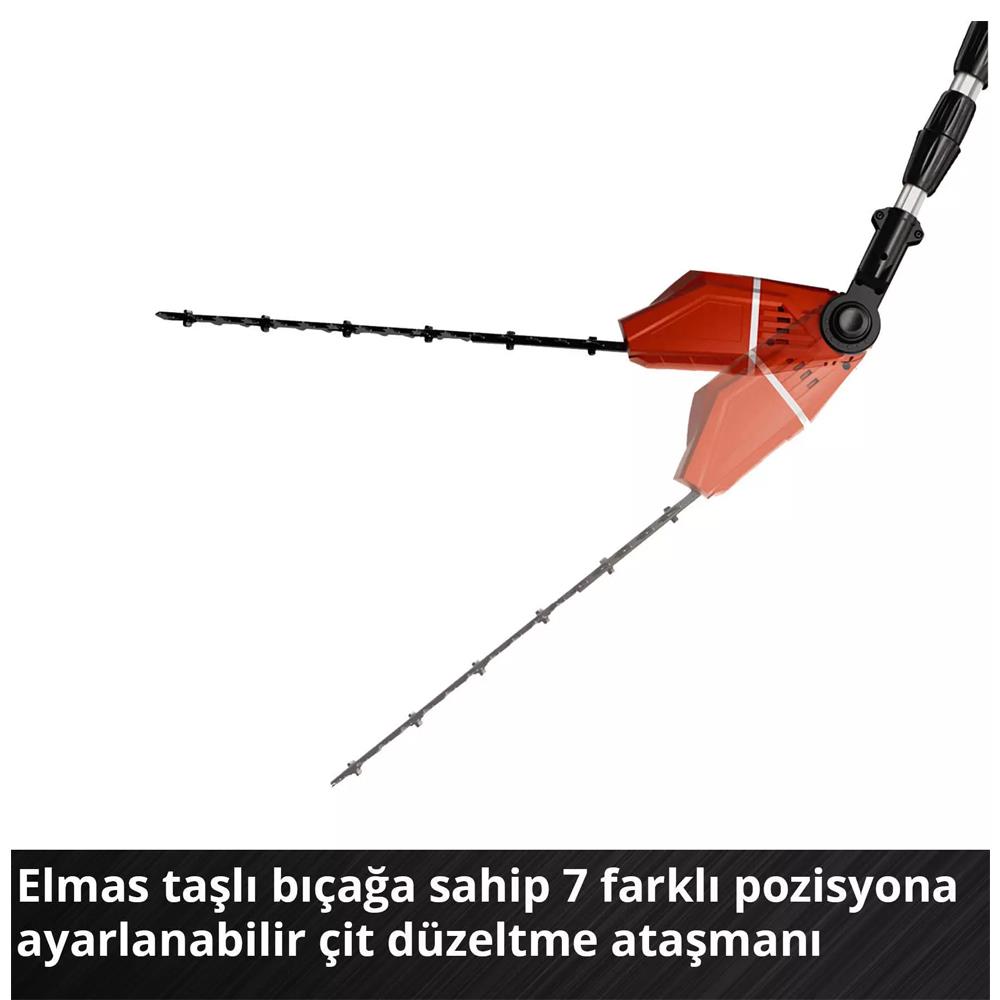 Einhell GE-HC 18 Li T Kit, yüksek dallara ve çalılıklara kolay erişim sağlayan akülü çok fonksiyonlu bir budama makinesidir. Hem dal kesme hem de çit budama işlevi sunan bu