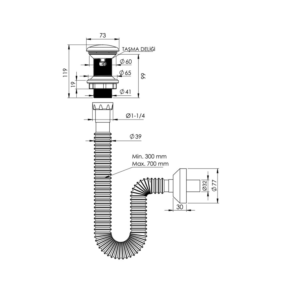 Elixir Pop Up Sifon Seramik Başlıklı Kırmızı ve Körüklü Gider Borusu Taşma Delikli