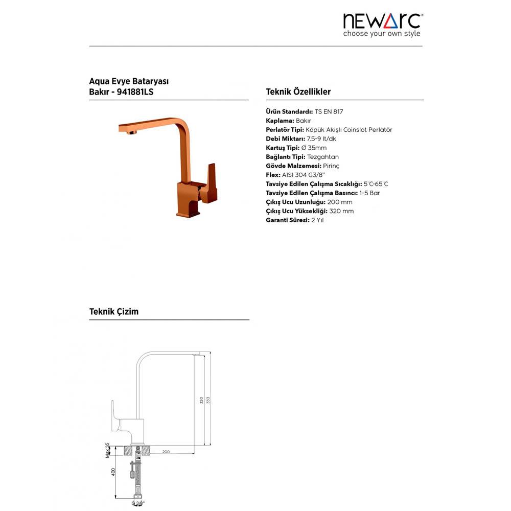 Newarc Aqua Eviye Bataryası Parlak Bakır 941881Ls