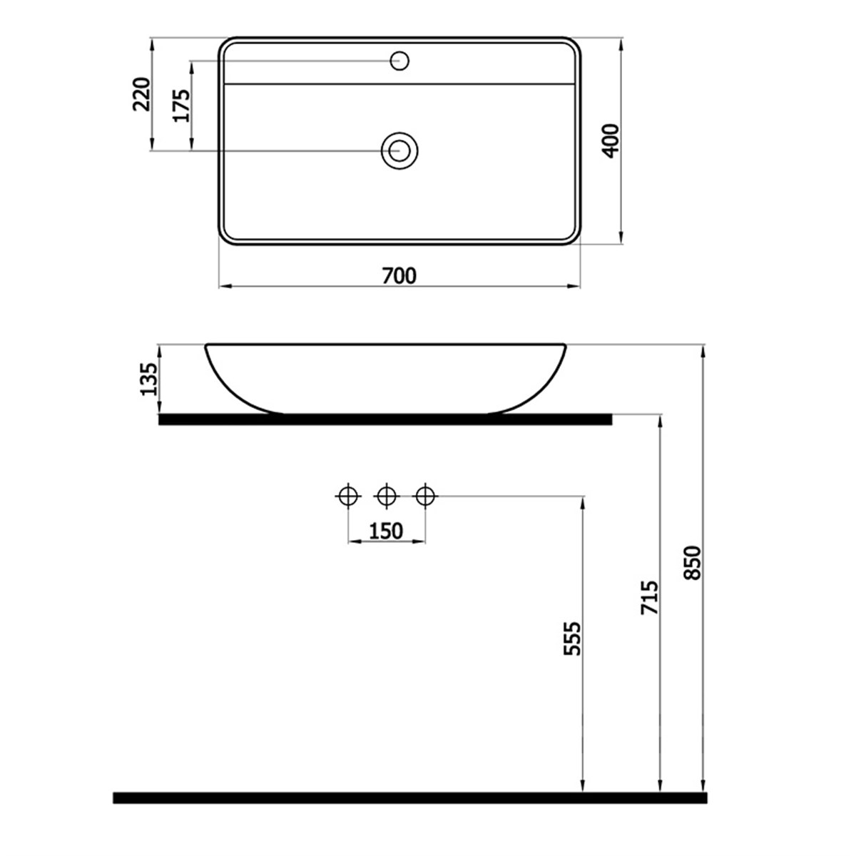 Newarc Domino Tezgah Üstü Batarya Delikli Lavabo Mat Siyah 70X40X13,5Cm 5019Bt-Mb