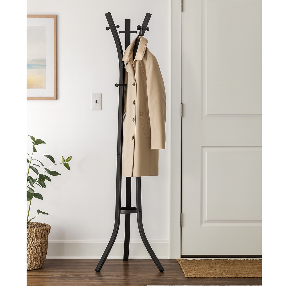 Ayaklı elbise askılığı, ev veya ofislerde giysilerin düzenli şekilde muhafaza edilmesi için kullanılan pratik bir mobilya ürünüdür. Özellikle mont, ceket, şapka ve çantaların yere bırakılmadan asılmasına imkân tanır. Böylece yaşam alanlarında düzen ve şıklık sağlanır. Hareketli yapısı sayesinde istenilen yere taşınabilir. Perilla portmanto serisinin bir ürünü olan Lobby 18002, dayanıklı malzemesi ve şık tasarımıyla öne çıkar.