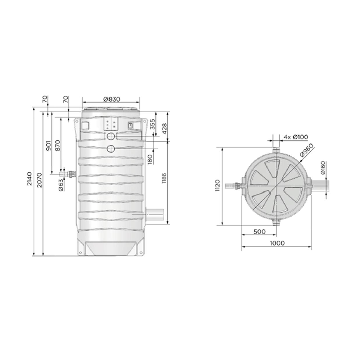 Foseptik pompa giriş dış çapı 160 mm, tahliye borusu dış çapı 63 mm ve havalandırma borusu dış çapı 100 mm'dir.Standart kontrol panosu