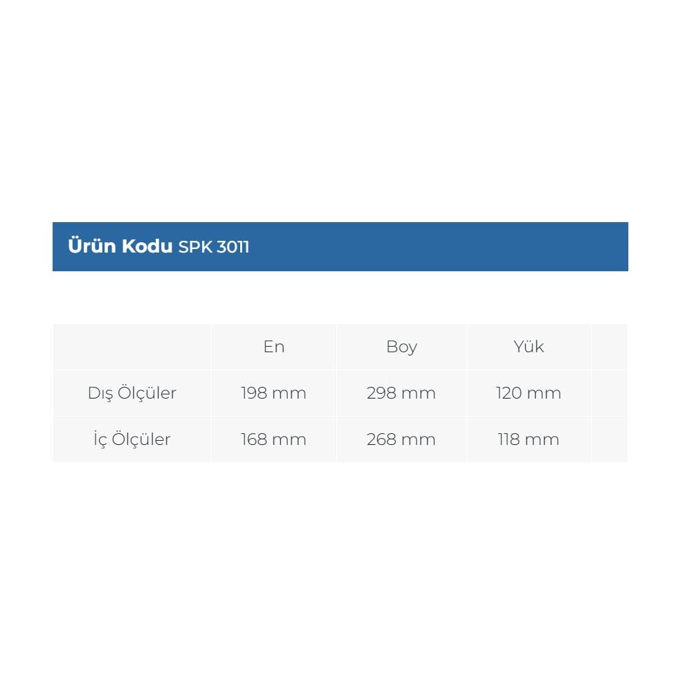 200x300 mm taban ölçüsüne ve 110 mm yüksekliğe sahip olan bu kasa, küçük ebatlı ürünlerin güvenli ve düzenli bir şekilde taşınması ve depolanması için idealdir. Gri rengiyle