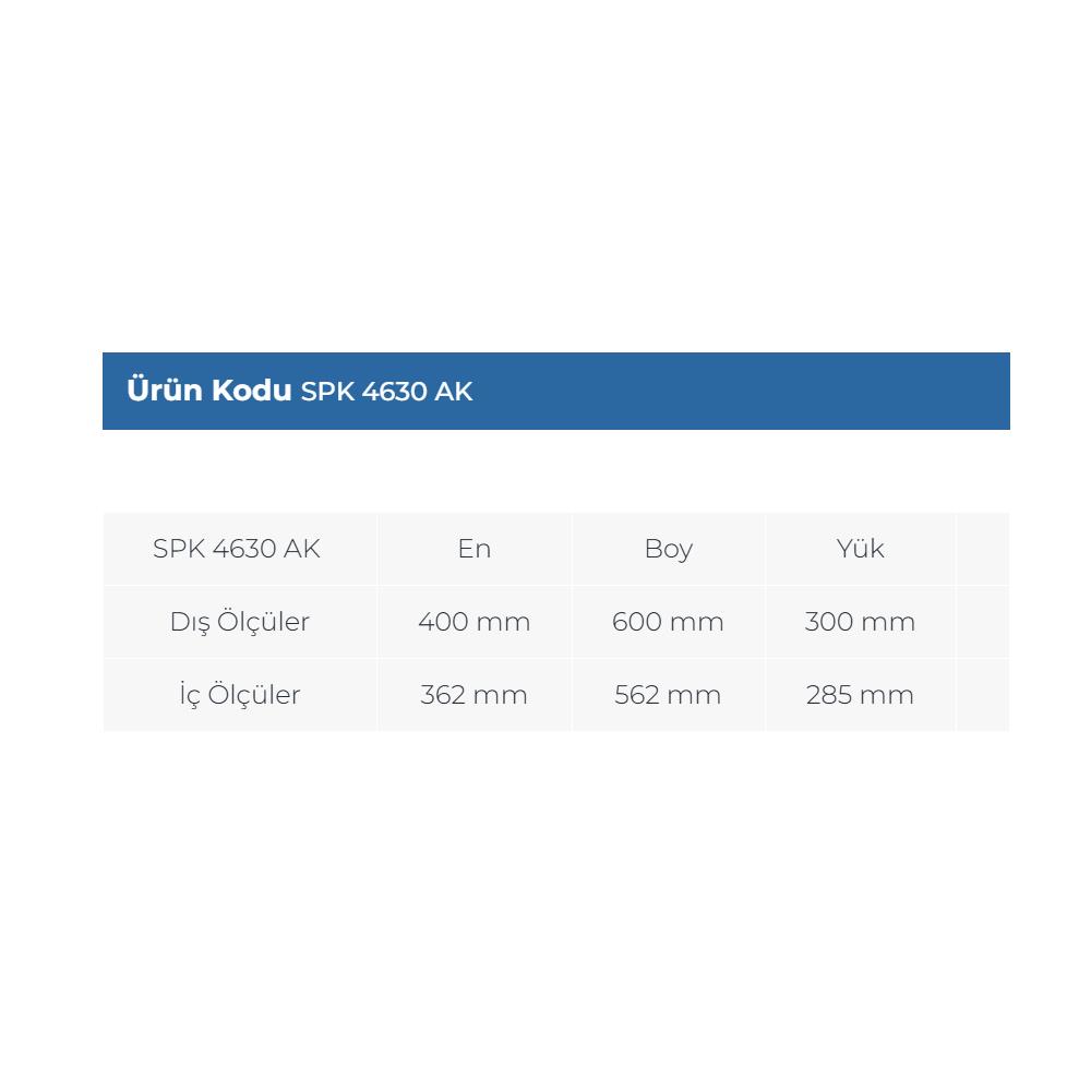 Sembol SPK 4630 AK, gri renkli, delikli taban ve kapalı yan yüzeylere sahip sanayi tipi kasadır. 400x600 mm taban ölçüsü ve 300 mm yüksekliği ile orta seviyede depolama ihtiyacı