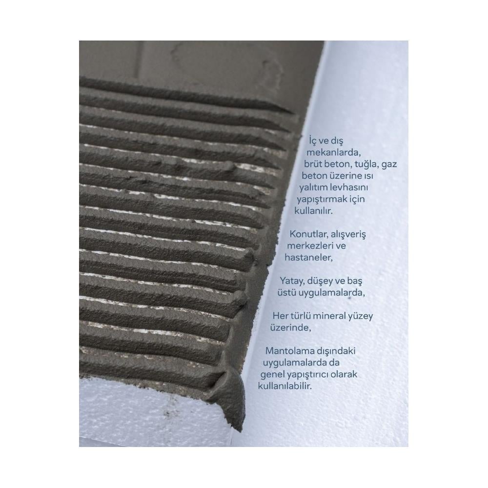 - İç ve dış mekânlarda, brüt beton, tuğla, gaz beton üzerine ısı yalıtım levhasını yapıştırmak için kullanılır.
