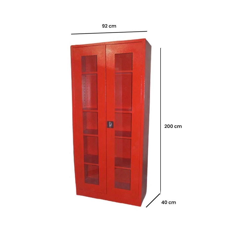Yangın malzeme dolabı pleksi kapaklı kırmızı, genellikle acil durumlarda kullanılan yangın söndürme tüpleri, hortumlar ve diğer ekipmanların düzenli bir şekilde saklanması ve